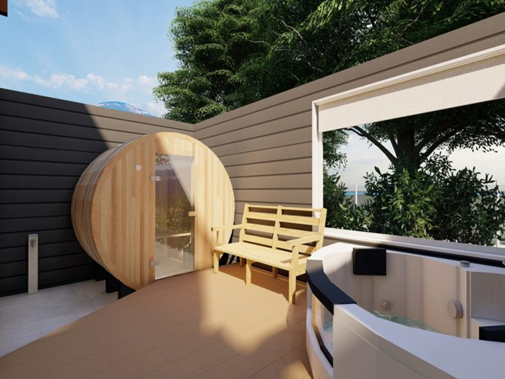 自宅で本格的なリラックス空間を楽しみたい方に人気のサウナ。屋上にサウナと浴槽、スクリーンを設置し、映画を観ながらラグジュアリーなバスタイムを楽しめる設計も可能です。